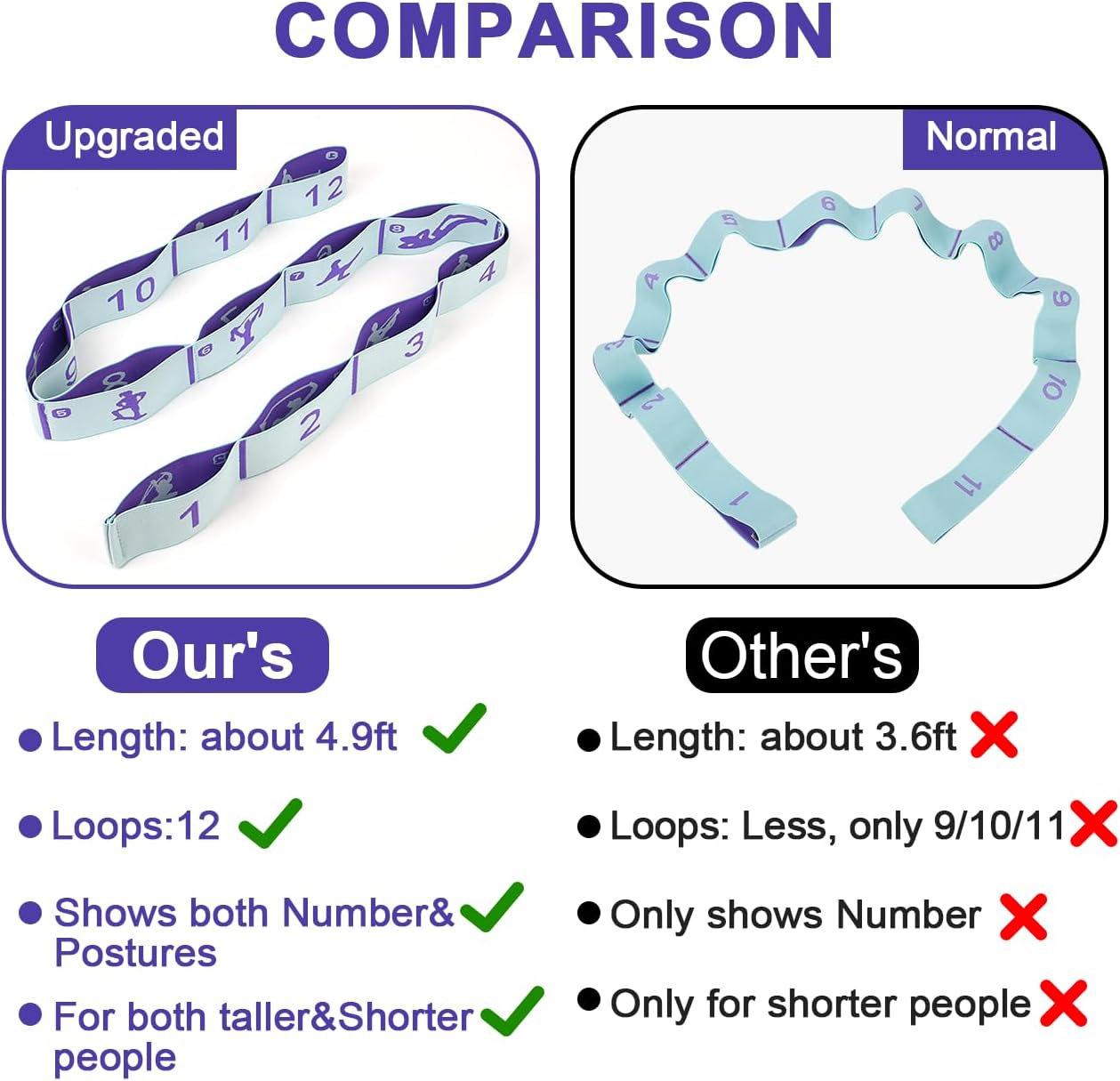 - ❖【2PCS Stretching Straps with Extra Long 12 Loops Design】 This stretch band has been UPGRADED. We lengthened the size and embroidered with a variety of yoga poses for user's reference. You don't have to worry about getting a size that's too short anymore!